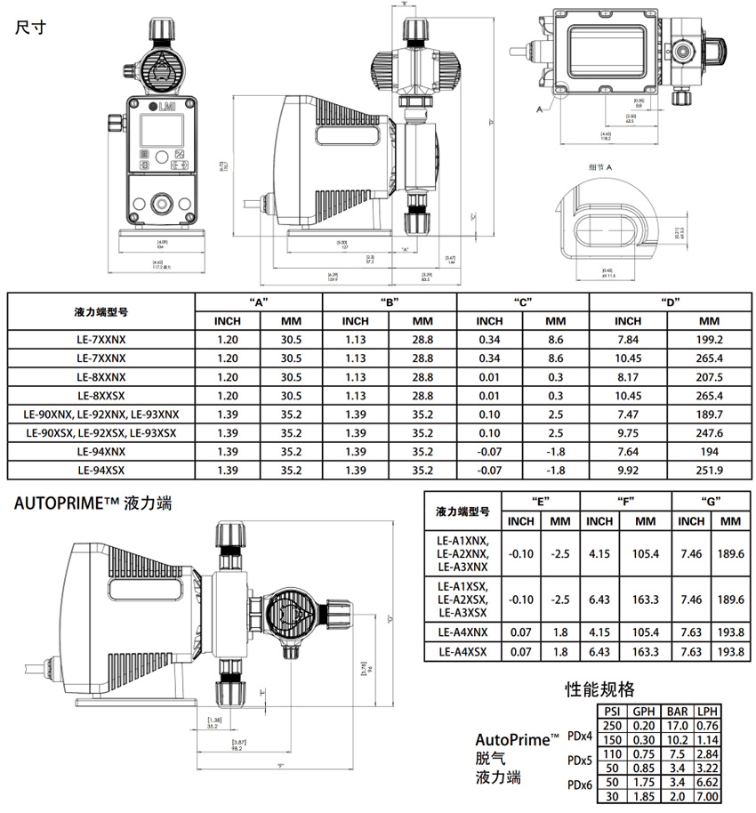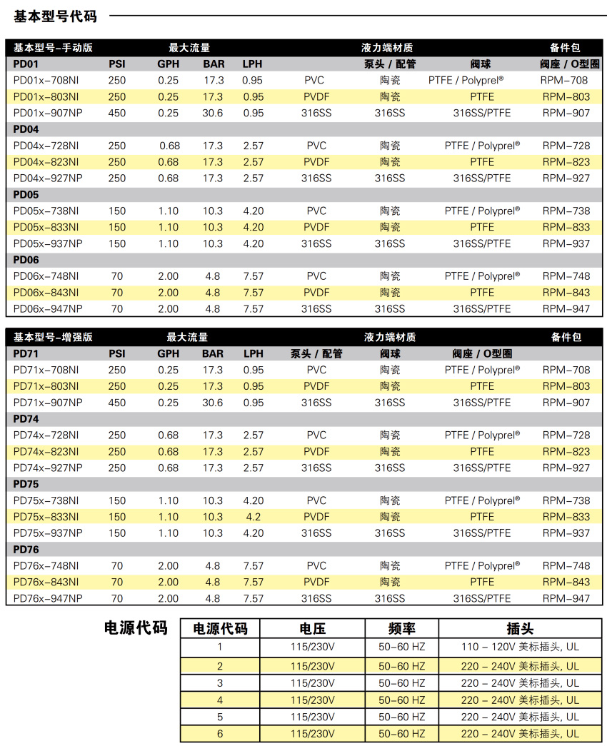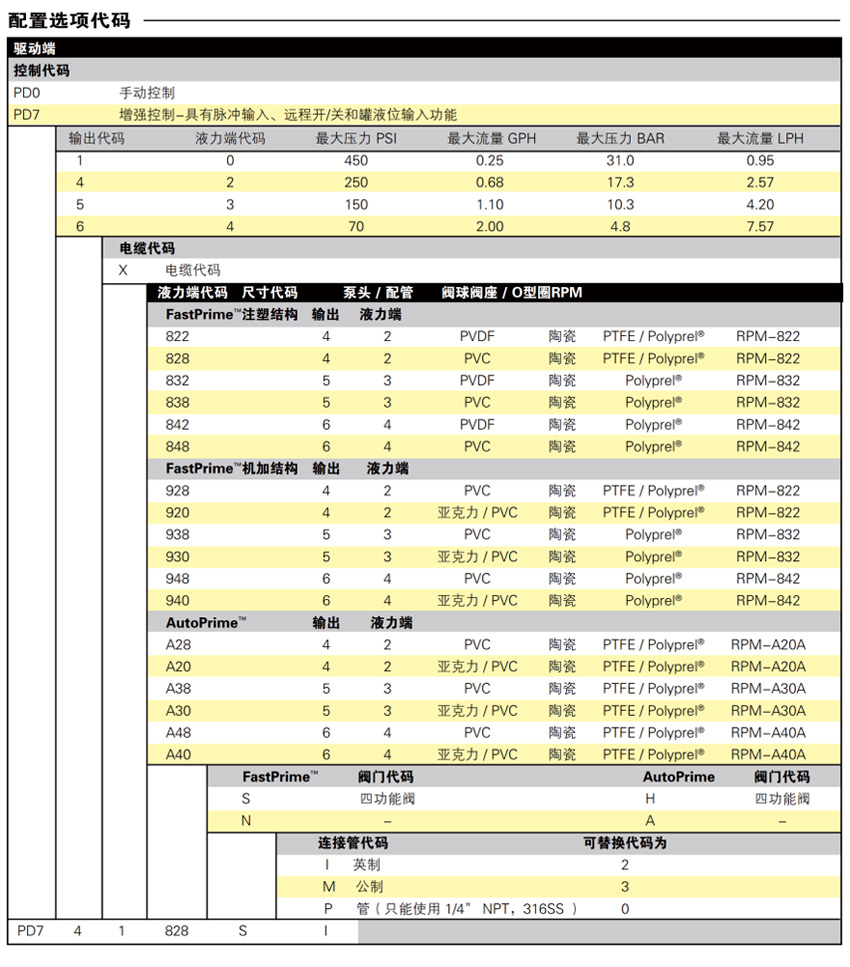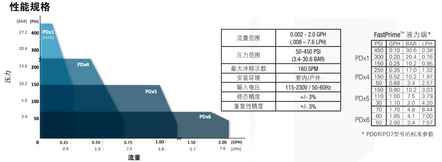 功能和优势: ●使用通用电源115-230V, 50/60 Hz的驱动平台 ●最大流量可达7.57L/H(2GPH),; 最大压力可达306bar(450PSI) ●采用恒定冲程长度的简化流量控制,在可调范围内保持校准具有动态补偿温度和电压条件的先进电子元件 ●FastPrime"液力端(标配),可通过集成排放阀快速简便地进行灌注 ●AutoPrime"液力端( 选配), 专为脱气液体而设计(有关性能规格请参阅第4页) ●NEMA 4X/ IP 65外壳结构坚固,适用于最恶劣的环境和户外使用 ●紧凑的尺寸,有效利用处理应用或OEM配置中的空间 ●代理认证- NSF 61和50 (申请中),ETL, CE ●具有数十年的经验,并享有LMI的两年保修支持 增强功能(PD7):